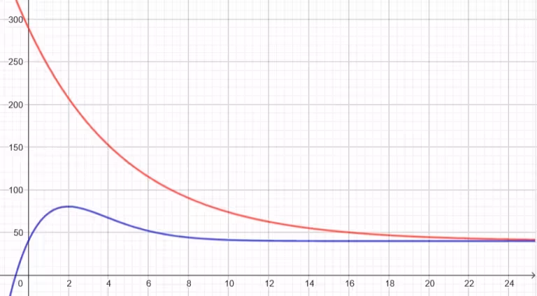 Die blaue Kurve zeigt den zeitverzögerten, begrenzten Anstieg der Temperatur in der unteren, kälteren Schicht durch Wärmeleitung.
