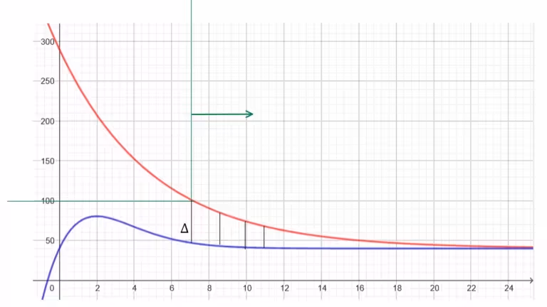 Die rote Kurve unterschreitet diese Temperatur zu einem bestimmten Zeitpunkt – ab diesem Punkt verliert das Polymer seine Fähigkeit zur plastischen Relaxation.